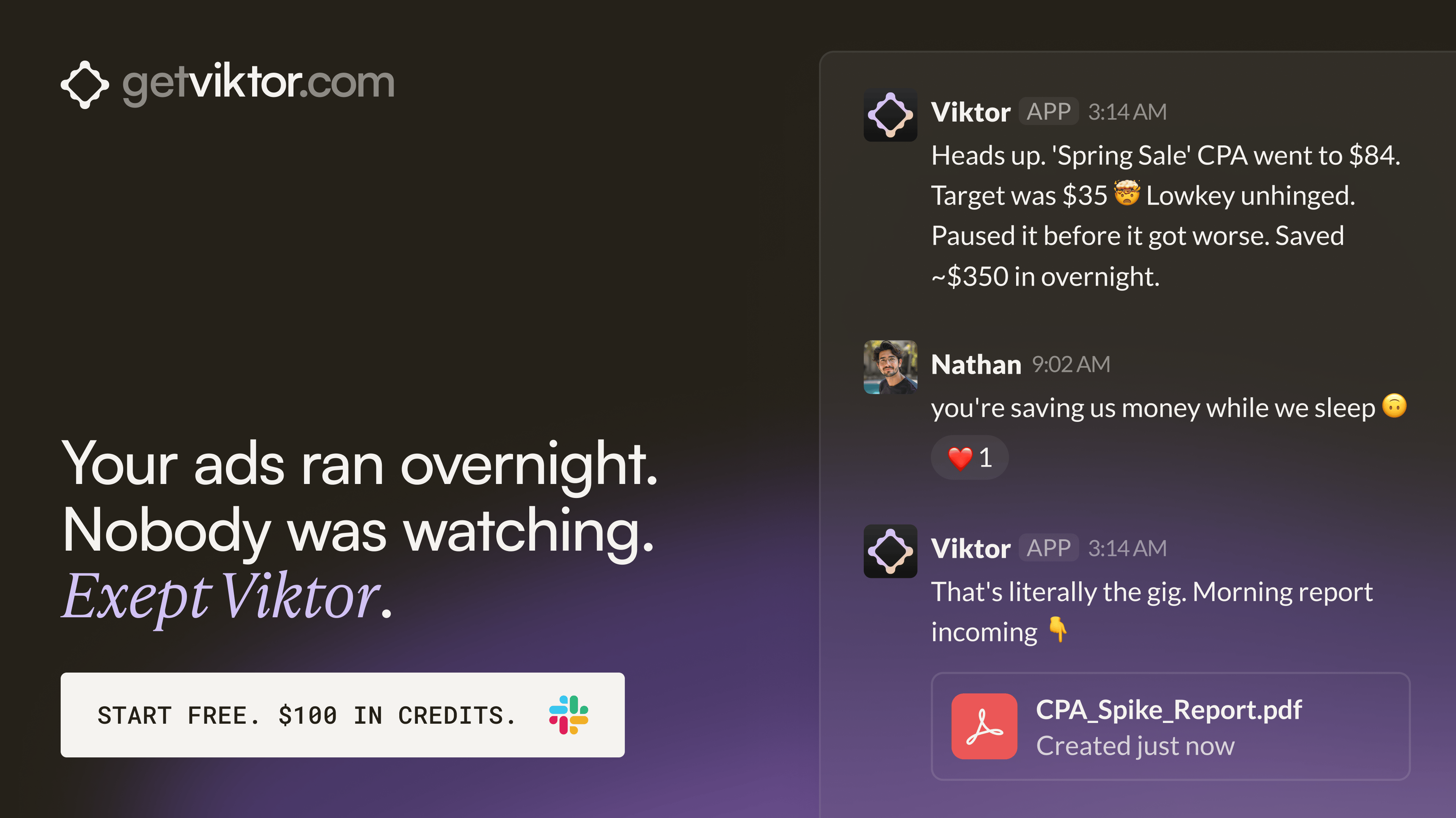 That same team has Viktor monitoring ad accounts across the portfolio and posting performance briefs before the day starts. One colleague. Always on. Across every account.